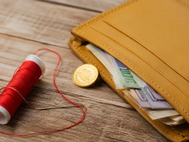 Протягніть нитку в голку і зробіть кілька акуратних стібків на внутрішній частині гаманця або на шматочку тканини, який потім покладіть усередину. Важливо робити це спокійно, без поспіху, подумки фіксуючи ідею стабільності та зростання.